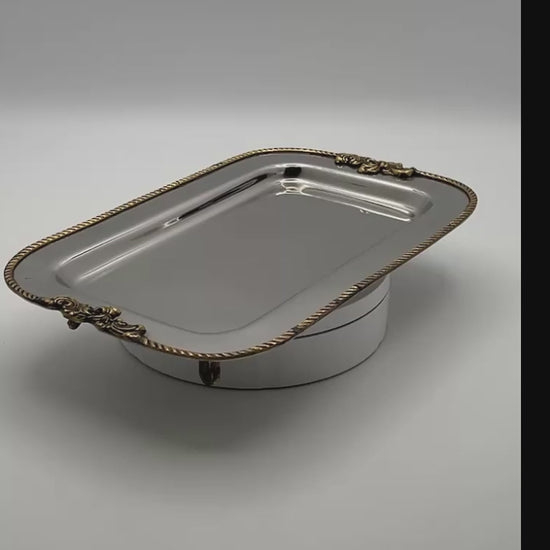 Experience the exquisite craftsmanship of this handmade stainless steel rectangular tray featuring a stunning brass beaded rim and elegant brass legs. Elevate your dining experience with this sophisticated and stylish tray. Add a touch of luxury to your table with the Rectangular Tray/ Two-tone St Steel & Brass/ 320019.